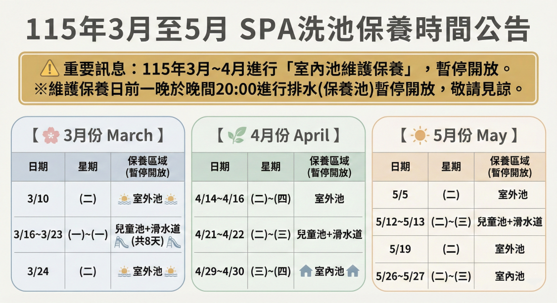 ※注1.三月份配合飯店維護工程,星河傳說溫泉水世界”室內池”有工程進行暫停使用,施工期間上午八點過後至下午五點有施工聲響,造成不便,敬請見諒,每月另有設施定期維護日期不對外開放,詳情請上官網查詢,未盡詳述事宜依飯店規定為主。