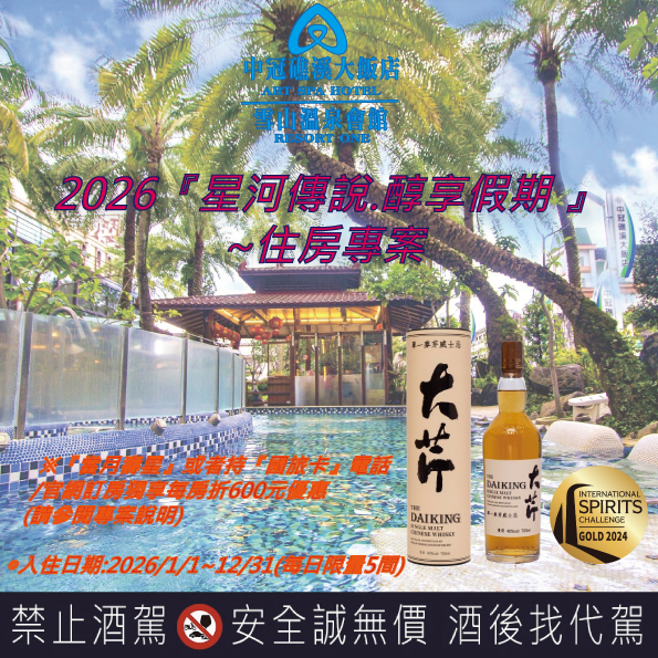 ⊙全民普發萬元加碼,單筆住宿消費滿萬元加贈大芹威士忌八百元折抵券(限定住房期間適用)
